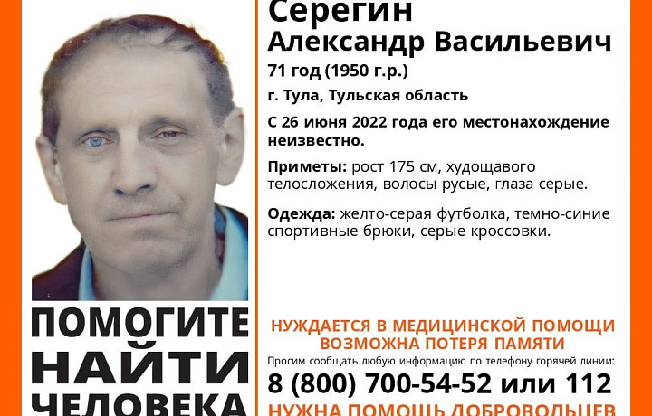 Информация об этом поступила от поисковиков из отряда «ЛизаАлерт» по Тульской области. Александр был одет в желто-серую футболку, темно-синие спортивные брюки и серые кроссовки. Из примет — рост 175 сантиметров, худощавого телосложения, волосы русые, глаза серые.