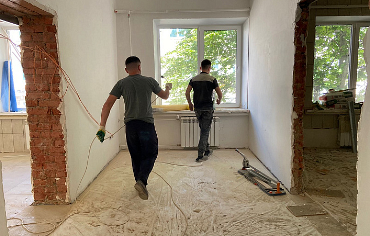 Работа ведется сразу в двух корпусах: в двухэтажном корпусе выполнена перепланировка и часть подготовительных работ, а в левом крыле трехэтажного корпуса демонтированы старые коммуникации, проводится укладка настенного и напольного покрытий.