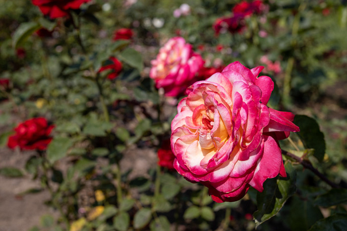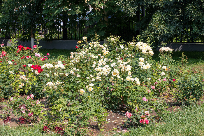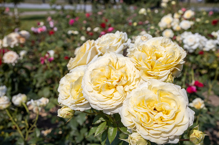 Как отметила эксперт, в Тульской области нет розария такого масштаба. По заказу музея специалисты высаживали уже взрослые, пятилетние парковые английские розы, кусты которых достигают высоты в 1,2 метра. Клумба построена про принципу градиента: в середине посажены сливочно-белые цвета, их окаймляют кусты с розовыми и темно-розовыми бутонами, и завершают композицию розы бордового оттенка.