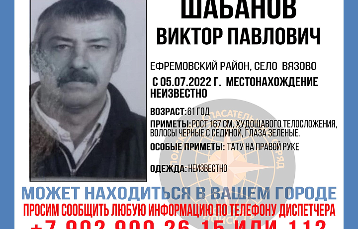 В селе Вязово Ефремовского района пропал 61-летний мужчина Шабанов Виктор Павлович. Местонахождение мужчины неизвестно с 5 июля 2022 года.