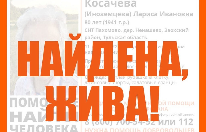 В селе Пахомово Заокского района Тульской области нашли живой пропавшую 11 июля 80-летнюю местную жительницу, сообщили в отряде «Лиза Алерт».