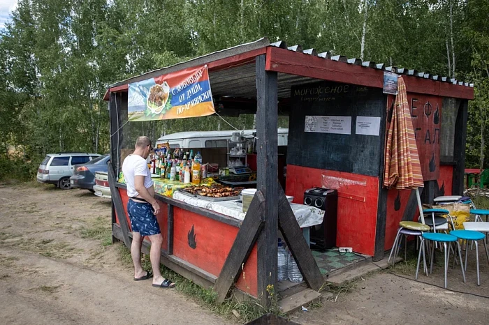 На въезде в Кондуки встречает контрольно-пропускной пункт и табличка с расценками. Мужчина в штатской одежде принимает как наличные, так и «безнал».