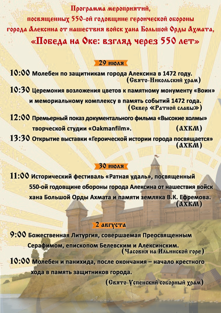 В Алексине пройдут мероприятия, посвященные 550-й годовщине героической обороны города от нашествия войск хана Большой Орды Ахмата