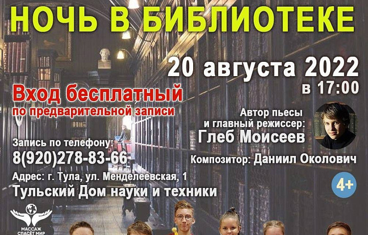 20 и 22 августа в Тульском Доме науке и техники пройдёт Чемпионат ЦФО по массажу и эстетике. В рамках культурной программы чемпионата 20 августа будет показан интерактивный музыкальный спектакль для детей и взрослых с тифлокомментированием «Ночь в библиотеке» от творческого сообщества «ЛИТteen».