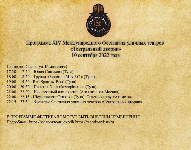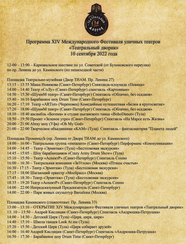 10 сентября в Туле в 14-й раз состоится международный фестиваль уличных театров «Театральный дворик». Так, организаторы опубликовали в соцсетях программу мероприятия.