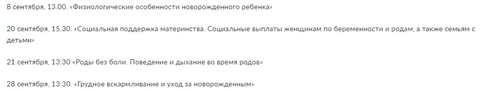 Министерство здравоохранения Тульской области опубликовало сентябрьское расписание занятий в школах материнства областного перинатального центра.