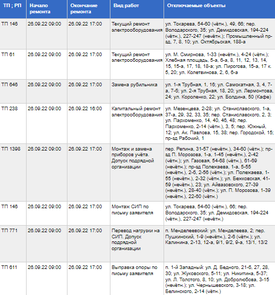 В понедельник, 26 сентября, по нескольким адресам Тулы отключат электричество из-за запланированных ремонтных работ, о чем сообщается на сайте Тульских городских электросетей.