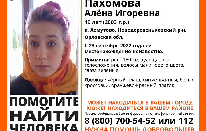 Пропавшая — Пахомова Алёна Игоревна, 19 лет. Ее местонахождение неизвестно с 28 сентября 2022 года.
