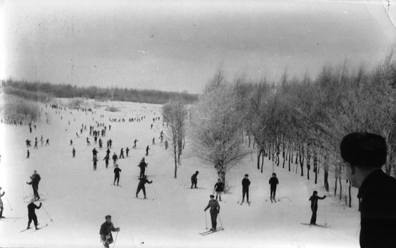 В 50-е – 70-е годы ХХ века деревья в парке были еще молодыми. На фото автор запечатлел соревнования лыжников на одном из прудов парка.