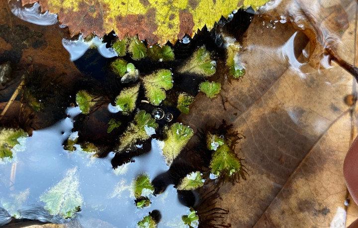 Слоевищный печеночник – около 0,5 сантиметров в диаметре, темно-зеленый, кожистый, формой напоминает маленький веер или сердечко.«Удивительный мох можно встретить в совершенно неожиданном месте. Не на стволе дерева, не на почве и даже не на камнях – в большой луже в глубине леса», – уточняется в публикации.