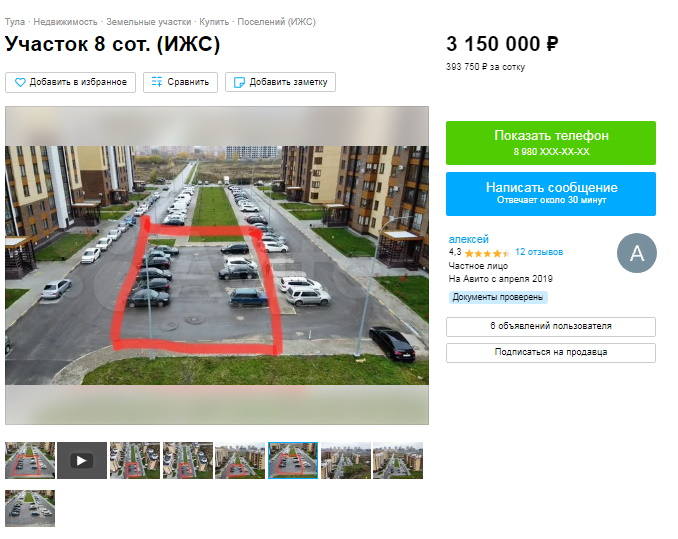 В Туле продают восемь соток земельного участка на парковке жилого комплекса за 3,1 миллиона рублей. Такая публикация появилась на сайте бесплатных объявлений.