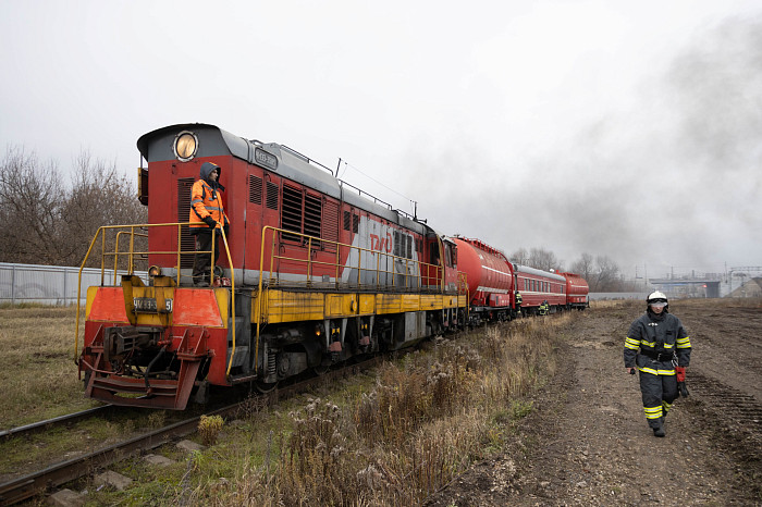 Командно-штабные учения экстренных, коммунальных и служб связи прошли в Туле во вторник, 8 ноября. По замыслу тренировки, на участке железной дороги с рельсов сошли два вагона и столько же грузовых цистерн, в результате чего одна из них с дизельным топливом загорелась и повредила емкость с химически-опасным веществом.