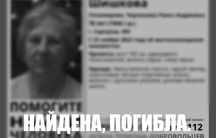 78-летняя Раиса Шишкова, пропавшая в Серпухове и разыскиваемая в том числе на территории Тульской области, найдена погибшей. Об этом сообщает региональное отделение поискового отряда «Лиза Алерт».