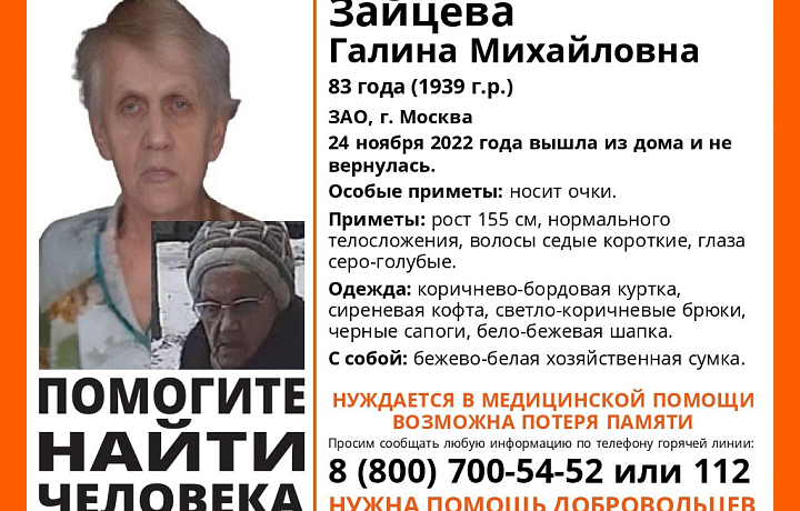 Пропавшая — Зайцева Галина Михайловна, 83 года. Ее местонахождение неизвестно с 24 ноября 2022 года.