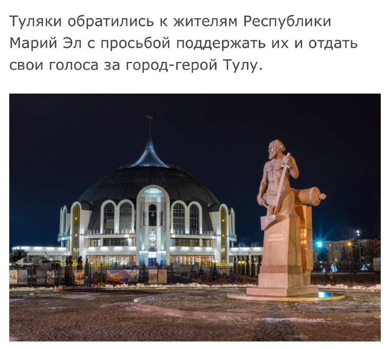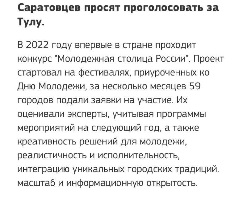 Напомним, что победителю достанутся многочисленные бонусы, среди которых проекты экосистемы Росмолодежи, в том числе федеральный грантовый конкурс, а также авторская медиастратегия для своего продвижения в течение 2023 года. Безусловно, Тула не только заинтересована в победе, но и заслуживает ее. Голосование продлится до 10 декабря.