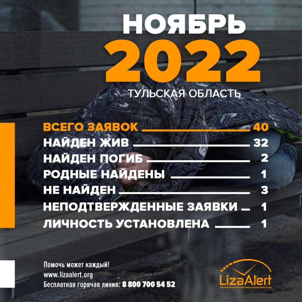 В ноябре поисковый отряд «ЛизаАлерт» по Тульской области получил 40 обращений на поиск пропавших людей, говорится на странице спасателей во «ВКонтакте».