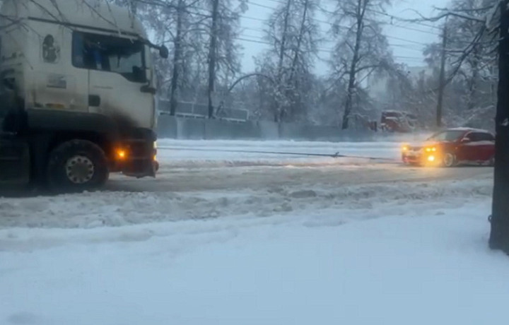 На улице Марата в Туле легковушка помогла буксующей фуре подняться в горку