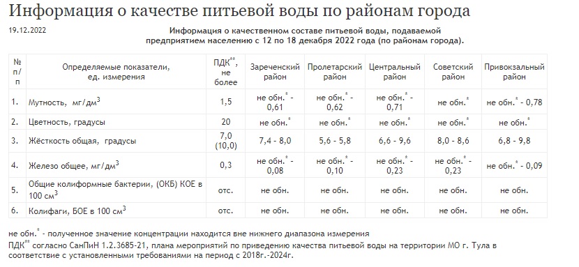 О показателях качества питьевой воды по районам областной столицы в период с 12 по 18 декабря 2022 года проинформировали жителей города специалисты АО «Тулагорводоканал».