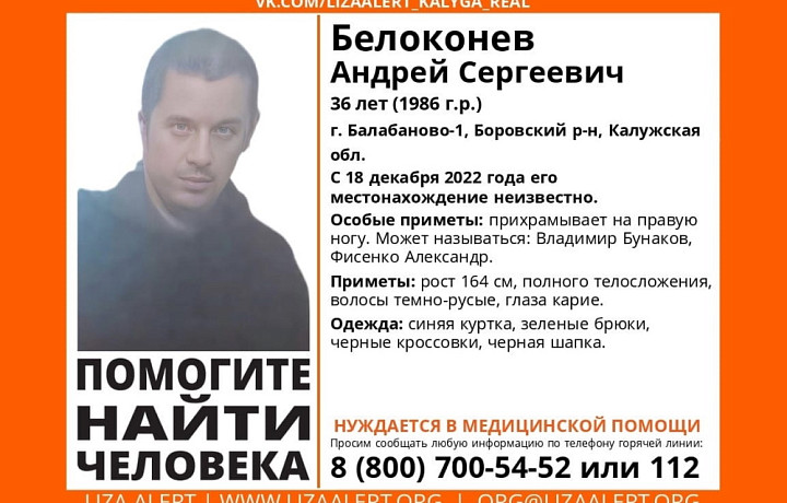 36-летний Андрей Белоконов, пропавший в городе Балабаново-1 Калужской области, может находиться в Тульской области, как сообщает поисковый отряд «Лиза Алерт».