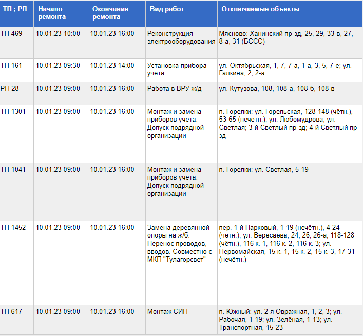 Сегодня, 10 января, часть Тулы останется без электричества, сообщили в ТГЭС.