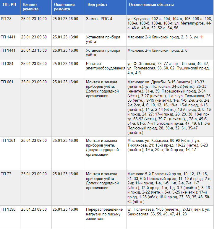 С видом проводимых работ, списком улиц и графиком отключения можно ознакомиться в таблице ниже: