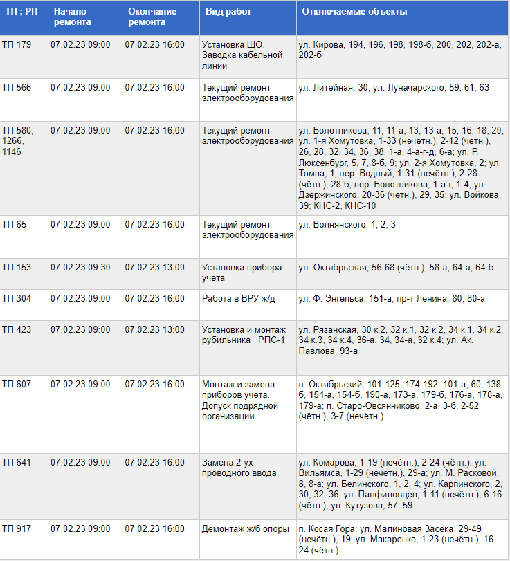 С полным списком адресов, где 7 февраля не будет электроэнергии, а также с видами выполняемых работ, можно ознакомиться в таблице, приведенной ниже.
