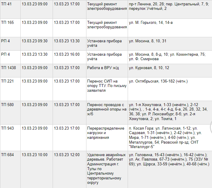 Отключение электроэнергии связано с проведением ремонтных работ по нескольким адресам. В таблице ниже указаны график отключения электричества, список проводимых ремонтных работ, а также список адресов, где не будет электричества: