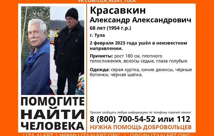 68-летний Красавкин Александр Александрович пропал 2 февраля 2023 года. По данным поисковиков, пожилой туляк ушел в неизвестном направлении и не вернулся.