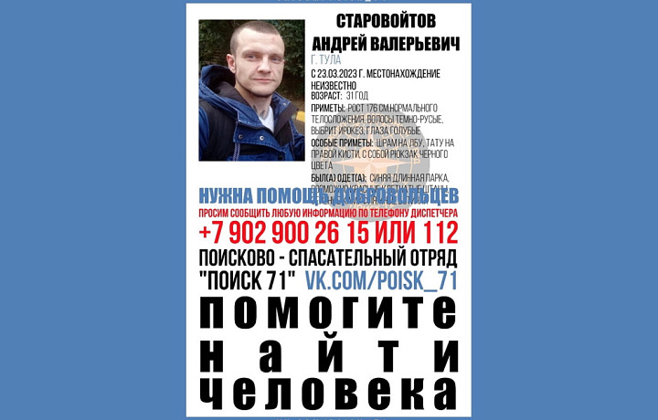В Туле пропал 31-летний Андрей Валерьевич Старовойтов, сообщает добровольческий поисково-спасательный отряд «Поиск 71». У мужчины ирокез, шрам на лбу и черный рюкзак с изображением футбольного клуба «Арсенал».