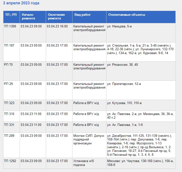 С полным списком адресов, где 3 апреля не будет электроэнергии, а также со всеми видами выполняемых работ, можно ознакомиться в таблице, приведенной ниже.