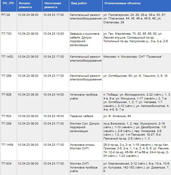 В понедельник, 10 апреля, по ряду адресов в Туле будет отключена электроэнергия, согласно информации, предоставленной АО «Тульские городские электрические сети».