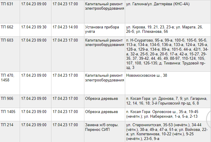 В понедельник, 17 апреля, по нескольким адресам в Туле и в Косой Горе отключат свет на время проведения плановых ремонтных работ. Об этом сообщается на Тульских городских электрических сетей.