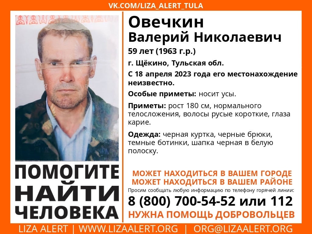 В городе Щекино Тульской области ищут 59-летнего мужчину. Мужчина не выходит на связь с 18 апреля. Об этом сообщают волонтеры поискового отряда «ЛизаАлерт»