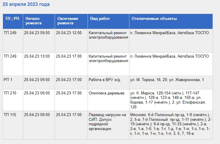 С полным списком адресов, где 25 апреля не будет электроэнергии, а также с видами выполняемых работ, можно ознакомиться в таблице, приведенной ниже.