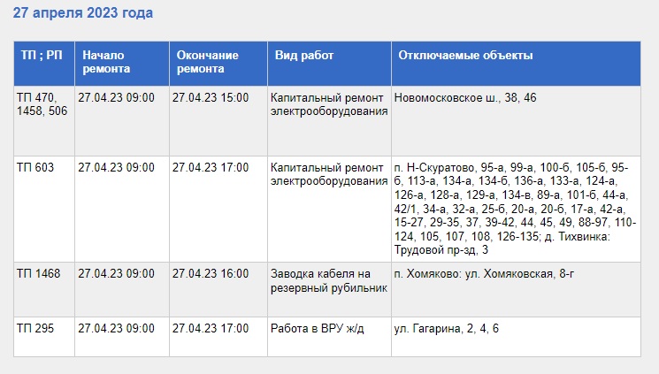С полным списком адресов, где 27 апреля не будет электроэнергии, а также с видами выполняемых работ, можно ознакомиться в таблице, приведенной ниже.