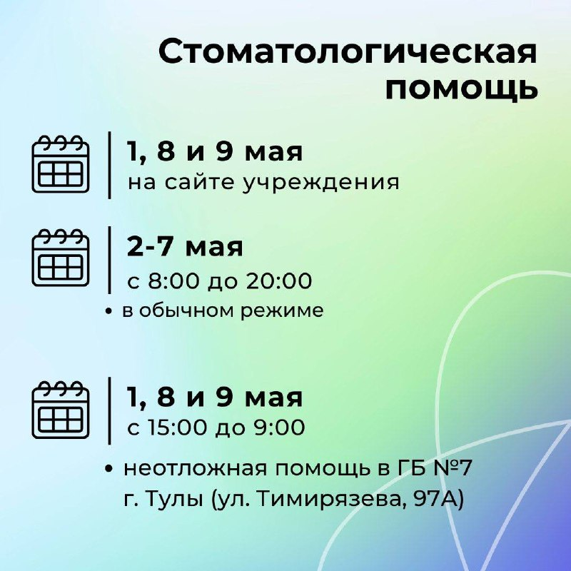 График работы медицинских учреждений в период майских праздников опубликовало в карточках министерство здравоохранения Тульской области. Рассказываем и показываем, когда и куда можно обратиться жителям.