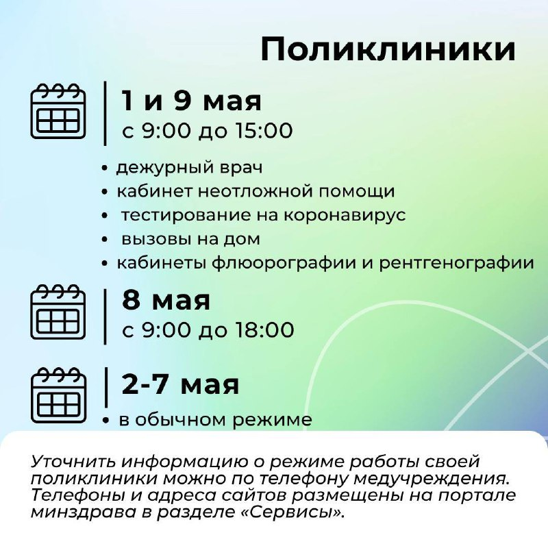 1 и 9 мая с 09:00 до 15:00, а также 8 мая с 09:00 до 18:00 во всех поликлиниках будут работать дежурные врачи и кабинеты неотложной помощи, кроме того, можно будет пройти тестирование на COVID-19, сделать рентген и флюорографию. В остальные дни поликлиники работают в стандартном режиме с 08:00 до 20:00.