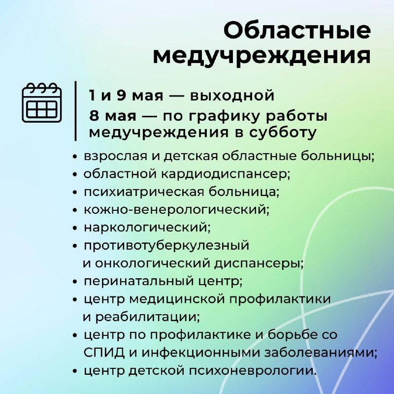 В медучреждениях региона 1 и 9 мая станут выходными днями, а 8 мая прием всех специалистов учреждений будет вестись с 09:00 до 18:00.
