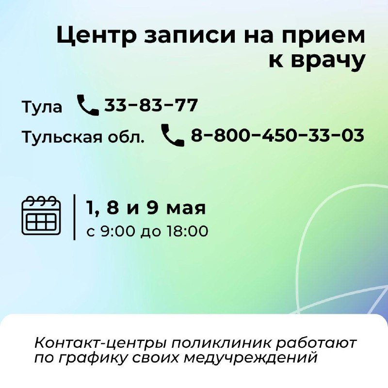 Кроме того, были опубликованы сведения о работе горячей линии, Центра записи на прием к врачу и графике аптек Тульской области в праздничные выходные дни.