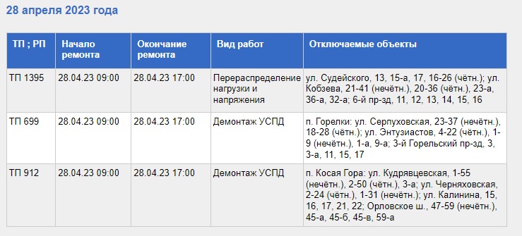 С полным списком адресов, где 28 апреля не будет электроэнергии, а также с видами выполняемых работ, можно ознакомиться в таблице, приведенной ниже.