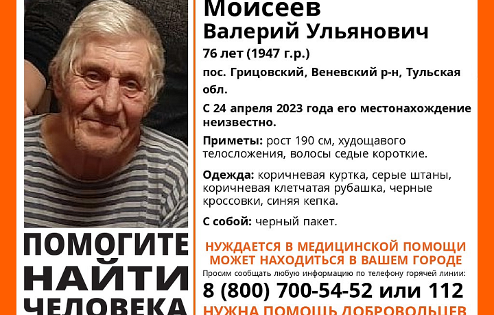 В поселке Грицовский Веневского района пропал 76-летний мужчина Моисеев Валерий Ульянович. Его местонахождение неизвестно с 24 апреля 2023 года.