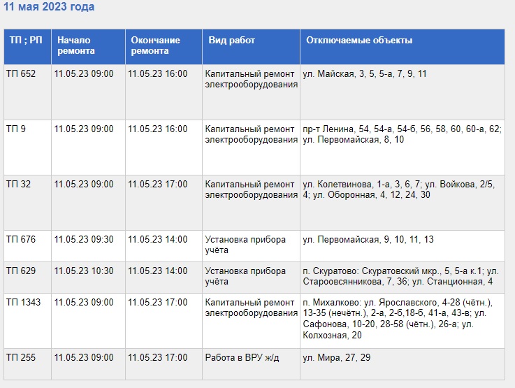 С полным списком адресов, где 11 мая не будет электроэнергии, а также с видами выполняемых работ, можно ознакомиться в таблице, приведенной ниже.