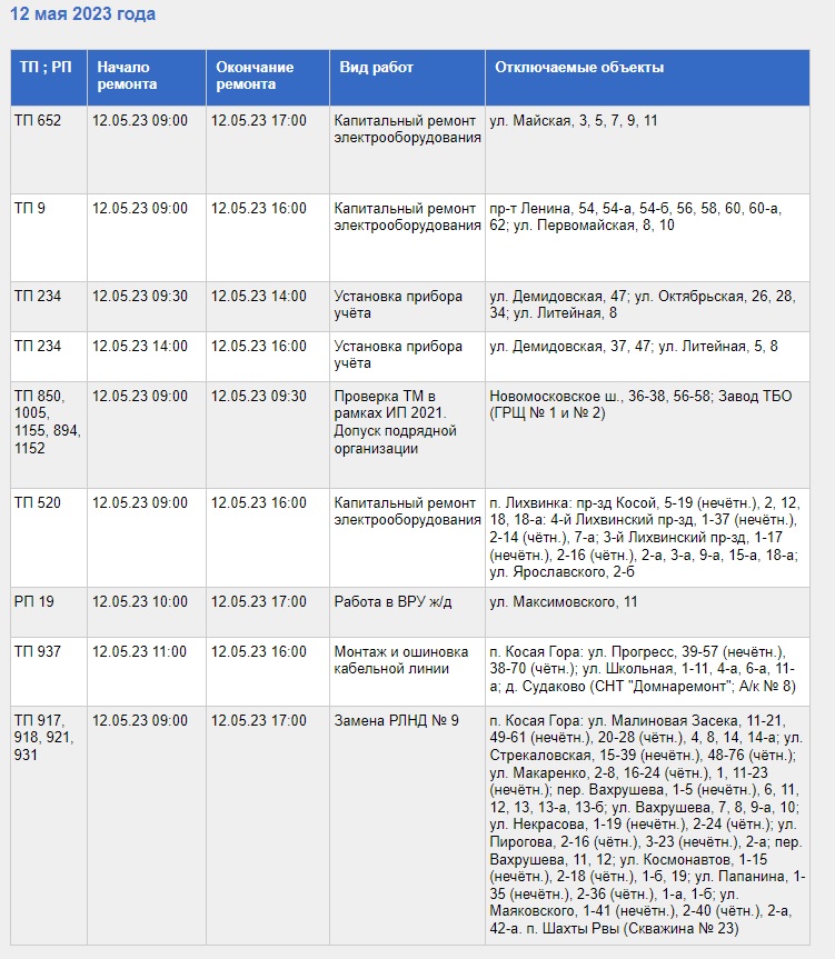 С полным списком адресов, где 12 мая не будет электроэнергии, а также со всеми видами выполняемых работ, можно ознакомиться в таблице, приведенной ниже.