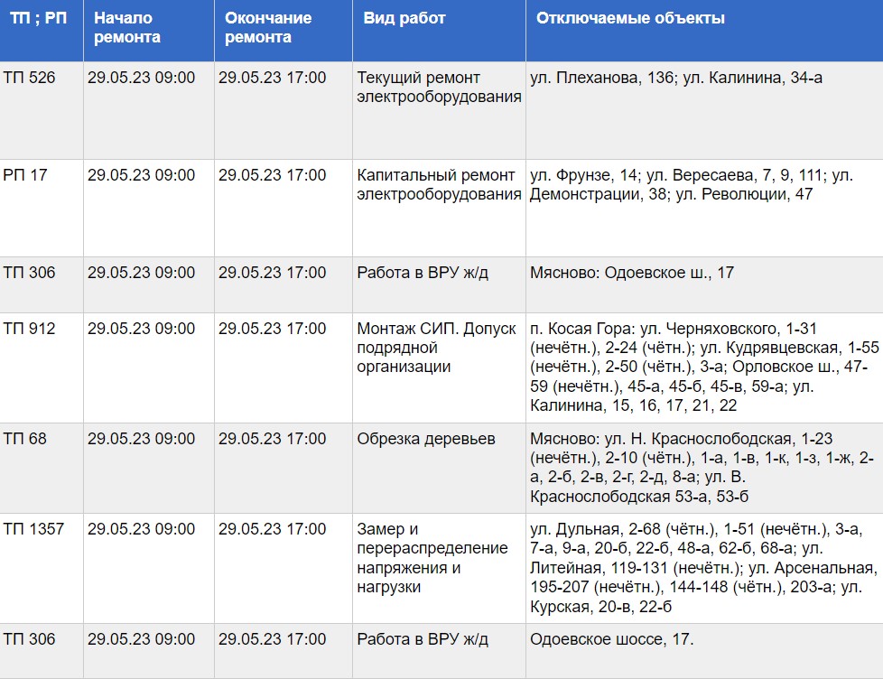 С полным списком адресов, где 29 мая не будет электроэнергии, а также с видами выполняемых работ, можно ознакомиться в таблице, приведенной ниже.