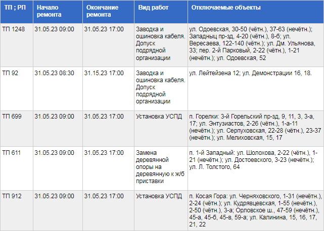 Энергетики в этот день планируют выполнить заводку и ошиновку кабеля, допуск подрядной организации, установку УСПД, замену деревянной опоры на деревянную к ж/б приставки, для чего необходимо временное отключение света.