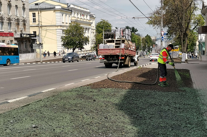 Так, работы проводились на проспекте Ленина на площади около 2 300 квадратных метров. Посев газонных трав рабочие выполняют с помощью гидросеялки, наполненной специальным составом (вода, семена газонных трав, удобрение, мульчирующий материал с природным красителем). Всходы ожидаются через 5-7 дней.