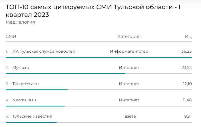 Тульская служба новостей возглавила рейтинг региональных СМИ по цитируемости за первый квартал 2023 года