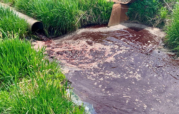 Экологи на месте нашли искусственно выкопанную траншею, которая тянется от выпуска трубы с территории мясокомбината. Именно по ней загрязненные стоки в больших объемах насыщенного красно-бордового цвета попадали в воду. При этом сами стоки имеют крайне неприятный, тошнотворный запах. Это свидетельствует о том, что они содержат в себе кровь убойных животных.