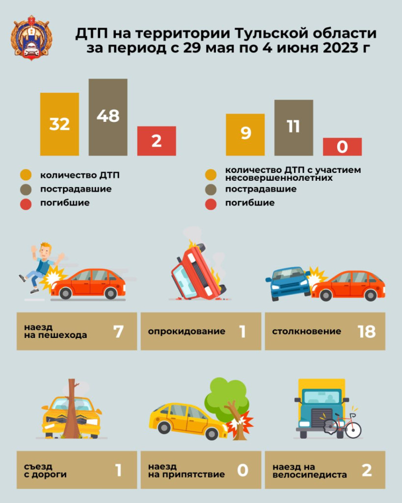 За минувшую неделю, с 29 мая по 4 июня, на дорогах Тульской области случились 32 автомобильные аварии. Такие данные приводит региональная Госавтоинспекция.