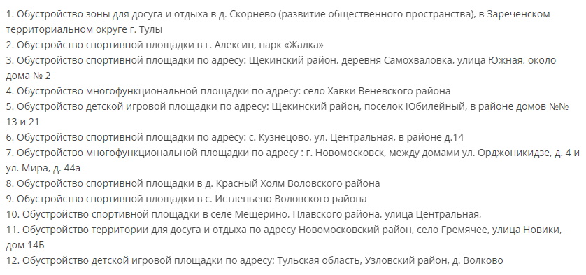 Так, в этом году по результатам конкурса будут реализованы 12 инициативных проектов сельских старост и руководителей ТОС по Тульской области:«Хорошо, что жители вовлекаются в процесс: знакомятся с проектами благоустройства, выбирают, голосуют, а старосты и руководители ТОС, в свою очередь, проводят большую работу, чтобы грамотно подготовить свои инициативы к голосованию. Хочется поблагодарить всех жителей, которые активно участвуют и в конкурсе, и в целом в благоустройстве своих населенных пунктов», – прокомментировала депутат облдумы Галина Алешина.